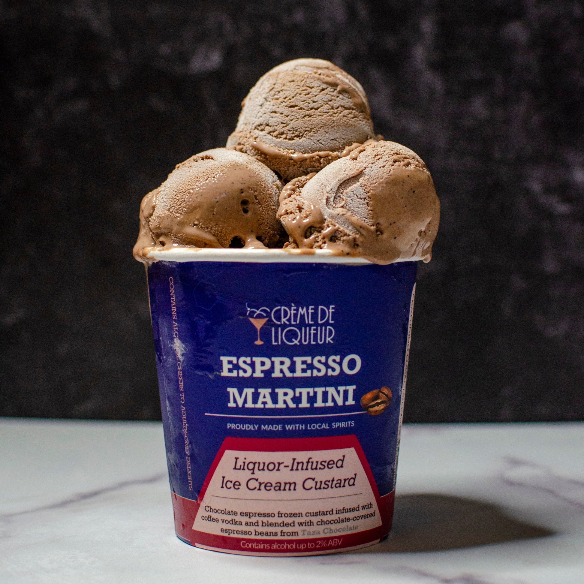 Espresso Martini ice cream? Yes please! Our Espresso Martini frozen custard is the perfect gift for the Espresso Martini lover in your life. Chocolate frozen custard is blended with flavorful espresso powder and infused with rich coffee vodka. Then, we mix it with chocolate-covered espresso beans which we source from the amazing Taza Chocolate out of Somerville, MA.
